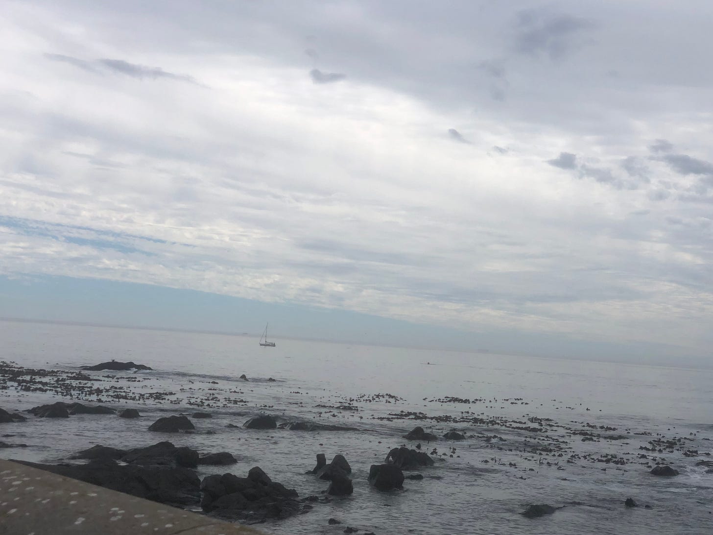 “The way the clouds cut crisply across the sky as if in murmuration leaving an envelope of pastel blue between the greying kelp sea. A lone ink sketch of a yacht out centre. Black and white photographs from the Orms competition along the promenade. Jonathan Inglis’s ‘Giuliette Price’ (a woman lying on pavilion seats at Hartleyvale) stands out. And benches in the shape of ducks and poodles which I had never noticed before. As well as a couple pushing prams – one with a baby, the other with a dog! A man passed out on the rocks had to be woken by a security guard as the tide came in.”