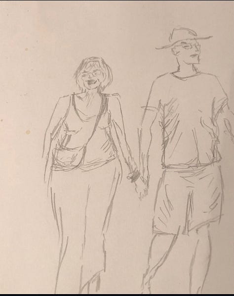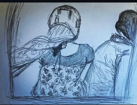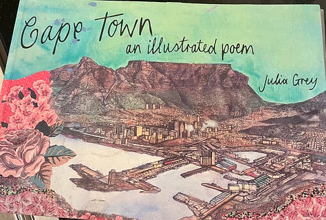 Kitchen pings: Sitting here in my kitchen (which, despite having a front room with ample desk space, is inexplicably my favourite workplace), I’m suddenly struck by how many odd items give me a ping when I look at them. The lovely Kalk Bay harbour calendar, Cape Town: an illustrated poem by Julia Gray, a 50th birthday gift from my mom-in-law, retro green and glitzy gold coffee jars gifted us by a friend in India after attending their son’s glitzy wedding, a very kitsch but very funky 80s sherry set left me by my mom, a Willow pattern cheese keeper left me by my dad left him by his mom, a bougie cookie jar from Kalk Bay craft market gifted me by my sister-in-law, and a pie-eyed doodle of a human on newspaper, which I often find myself doing in ‘between time’. Every now and then I’ll hit a flurry of sketches of people; my brother doesn’t understand why I didn’t follow that path, but I’ve only ever thought of it as a casual hobby.
